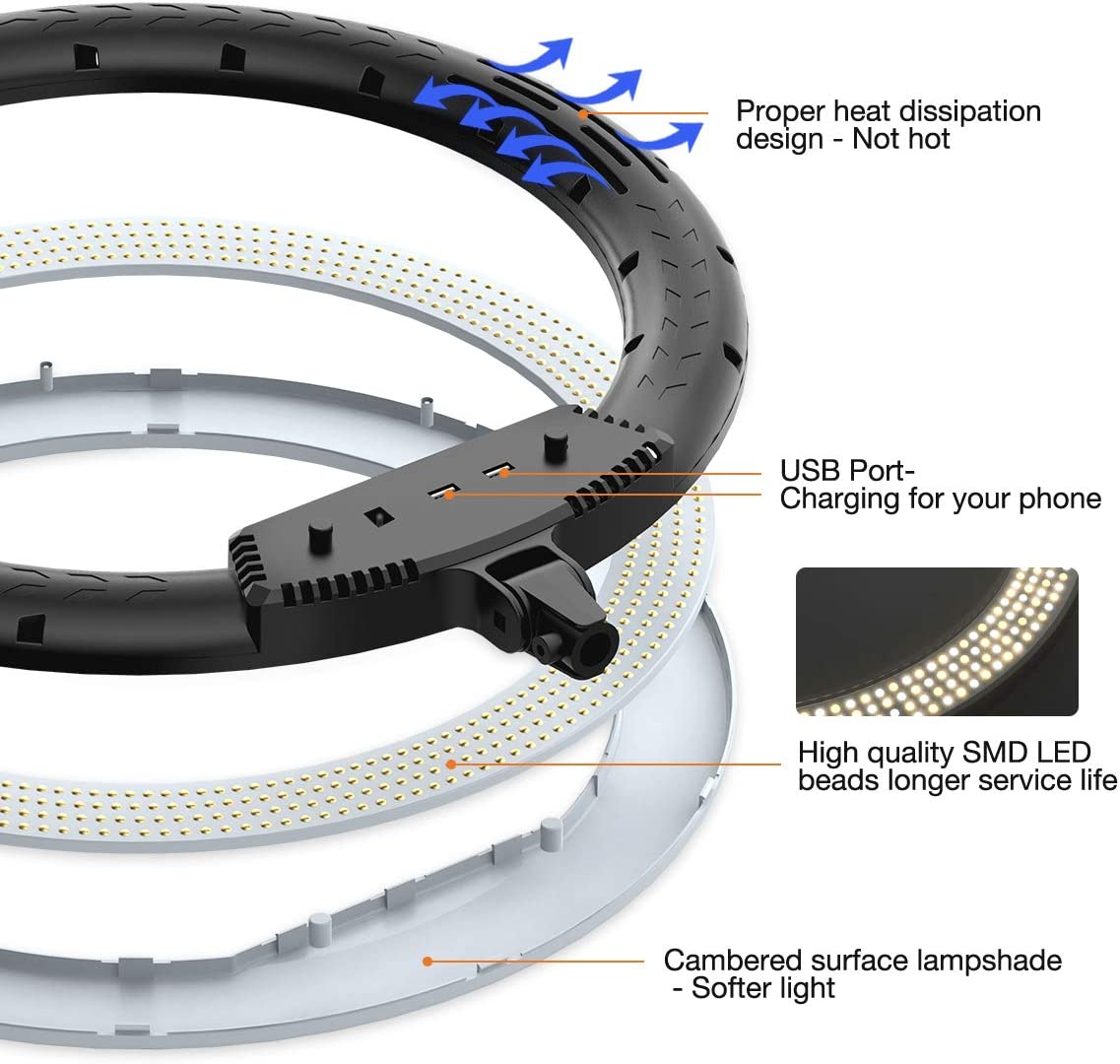 Flexible & Rotatable Phone Holder – ring light comes with 3 hot shoe ports that allow you mount 3 phones, and 2 USB charging ports for your smart phone charging while livestream. It’s compatible with most smart phones with or without a case.