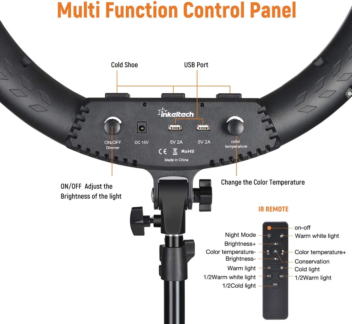 • Intelligent and quick color change – Inkeltech Ring Lights are controlled via the IR remote controller or the knob on the stand. Adjust the color temperature from 3000 K to 6000 K easily without using color filters. Achieve cold white light or warm light to hide blemishes and change skin tones quickly and easily. LED SMD design and 480 pcs LED beads on our Ring Light offers more light for your camera photography, live streaming, Facebook Live, beauty makeup, selfies and videos.